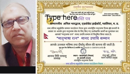 - गीतकार अनिल भारद्वाज नेपाल संस्था द्वारा मातृभाषा रत्न उपाधि से हुए सम्मानित