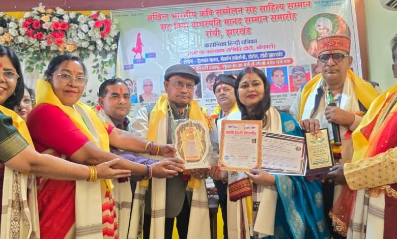 utkarshexpress .com बोकारो (झारखंड) – कहानिका हिंदी पत्रिका बोकारो झारखंड का आज इस्पात क्लब मेकॉन कॉलोनी , डोरंडा,रांची , झारखण्ड में कहानिका हिंदी पत्रिका (महिला कल्याण समिति ढोरी, बोकारो द्वारा संचालित )द्वारा एक भव्य अखिल भारतीय कवि सम्मेलन सज साहित्य सम्मान विद्या वाचस्पति मानद सम्मान समारोह का आयोजन किया गया। जिसमें मुख्य अतिथि के रूप में डॉ कमल बॉस,भूतपूर्व विभागाध्य हिंदी विभाग संत जेवियर्स कॉलेज रांची, विशिष्ठ अतिथि के रूप में प्रतिभा प्रसाद कुमकुम,जमशेदपुर ,मनीषा सहाय सुमन रांची और अनिता रश्मि रांची ने भाग लिया। सभा की अध्यक्षता / संयोजन डॉ श्याम कुंवर भारती ,प्रधान संपादक सह महासचिव मकस ने किया। मंच का संचालन मधुमिता साहा उप संपादक कहानिका झारखंड अध्याय ने किया।