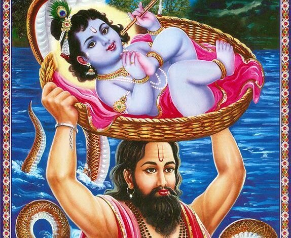 वासुदेव जी ने एक टोकरी लेकर जिसमें कि उनका खाना आता था,इसमें कपड़े बिछाकर कृष्ण जी को लिटाया और टोकरी को सिर पर रखकर कारागार से निकल पड़े। कारागार से बिल्कुल सीधा रास्ता यमुना जी को जाता है। यमुना जी कारागार से लगभग दो कोस दूरी पर है।ज्यों ज्यों वासुदेव आगे बढ़ते जाते थे , बारिश और तेज होती जा रही थी। कमर तक पानी में चलकर वासुदेव यमुना जी पहुंच गए पर यह क्या यमुना जी अपने पूरे उफान पर थी। बारिश और तेज होने लगी यहां तक कि पानी वासुदेव जी के गले तक आ गया पर यमुनाजी थी कि थमने का नाम ही नहीं ले रही थी। तभी शेषनाग ने अपना फन फैलाकर भगवान कृष्ण के ऊपर छतरी बना दी। भगवान कृष्ण के पंजे टोकरी से थोड़ा बाहर निकले हुए थे। यमुना जी बढ़ते बढ़ते भगवान कृष्ण के पैरों अंगूठे को स्पर्श करने आई। भगवान कृष्ण के चरणों का स्पर्श कर यमुना जी धन्य हो गई और उन्होंने अपनी तीव्रता कम कर दी।