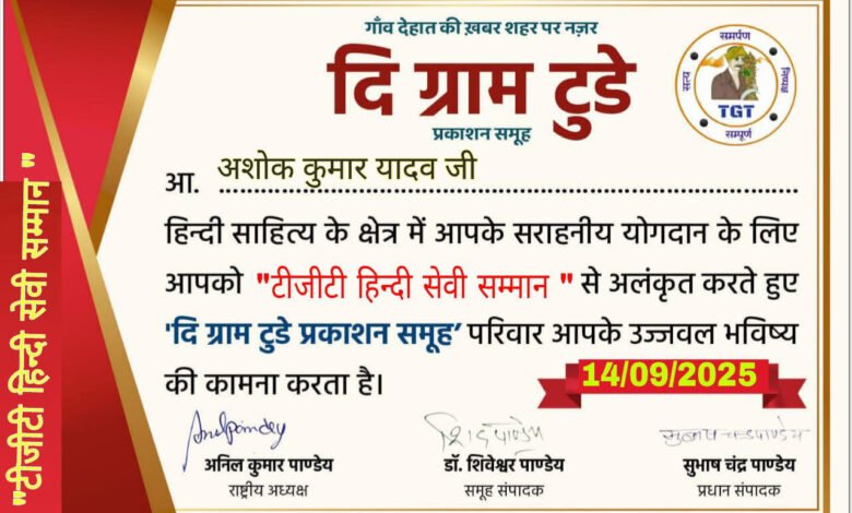Utkarshexpress.com मुंगेली। दि ग्राम टुडे प्रकाशन समूह देहरादून, उत्तराखंड के द्वारा हिन्दी दिवस के अवसर पर भारत के विभिन्न राज्यों के कवि, कवयित्री एवं साहित्यकारों को सम्मानित किया गया। इस अवसर पर मुंगेली, छत्तीसगढ़ के कवि एवं साहित्यकार अशोक कुमार यादव, संस्थापक / अध्यक्ष यादव समाज सेवा, कला, संस्कृति एवं साहित्य उन्नयन समिति को हिन्दी साहित्य के क्षेत्र में सराहनीय योगदान के लिए “टीजीटी हिन्दी सेवी सम्मान” से अलंकृत किया गया। अलंकृत होने पर संगीता यादव, कैलिसा यादव, डॉ.अलका यादव बिलासपुर, वंदना, मोहित कुमार यादव, कवि सुरेश कुमार बन्छोर, कवि अशोक पटेल आशु, कुश कुमार साहू, सतानंद यादव, कवि प्रीतम साहू, यशवंत पात्रे, पून्नू गौंटिया लोरमी, जलेश्वर दास मानिकपुरी, कवि मूक्कू यादव बिलासपुर, कवि रामकेश यादव मुंबई, चंपालाल बंजारे, सूरज बघेल बिलासपुर, गोपीचंद लाश्कर, विजय यादव, रोहित सोनवानी, प्रकाश यादव दामापुर, खेलन वर्मा, हरीश यादव, हितेश्वर बर्मन चैतन्य सहित अन्य दोस्तों, परिजनों एवं शिक्षकों ने शुभकामनाएँ एवं बधाई दी।