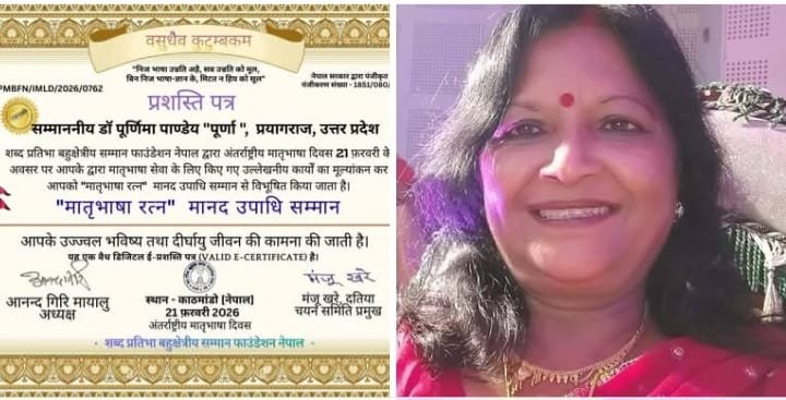डॉ पूर्णिमा पांडेय को नेपाल से मिला मातृभाषा रत्न अंतर्राष्ट्रीय मानद उपाधि सम्मान
