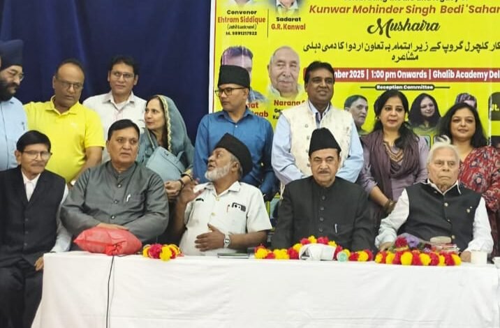 utkarshexpress.com नई दिल्ली – गत शाम फ़नकार कल्चरल ग्रुप, रजिस्टर्ड के ज़ेर-ए-अहतमाम ग़ालिब अकादमी हज़रत निज़ामुद्दीन नई दिल्ली में कुंवर मोहिंदर सिंह बेदी सेहर की याद में एक शानदार ऑल इंडिया मुशायरे का इनक़ाद किया गया। सदारत मारूफ़ शायर जी आर कमाल ने की जबकि इस मौक़े पर नारंग साकी अवतार सिंह ” सुरेंदर सिंह शजर ”डॉ गुरविंदर बांगा मतीन अमरोहवी ख़ुमार देहलवी मेहमान-ए-ख़ुसूसी की हैसियत से तशरीफ़ लाए। निज़ामत के फराइज़ असलम बेताब और फोजिया अफ़ज़ल ने अंजाम दिए।