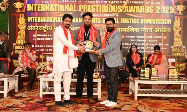 जयपुर (राजस्थान) के राज आंगन रिसॉर्ट में आयोजित अंतरराष्ट्रीय प्रतिष्ठित पुरस्कार समारोह 2025 में अंतरराष्ट्रीय मानवाधिकार सामाजिक न्याय आयोग के उत्तराखंड राज्य के प्रदेश सचिव कुलदीप नेगी को राष्ट्रीय अध्यक्ष डॉ संतोष बजाज, आसपुर के विधायक उमेश डामोर एवं सेवानिवृत्त IPS, IAS अधिकारियों द्वारा सम्मानित किया गया। समारोह में देश की कई जानी मानी दिग्गज हस्तियाँ एवं विश्व प्रसिद्ध सामाजिक हस्तियाँ भी मौजूद रही ।
