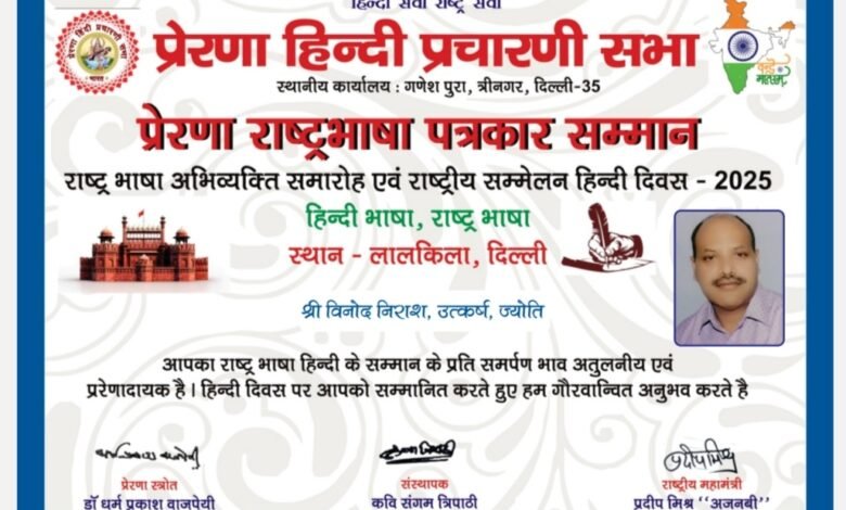 utkarshexpress.com जबलपुर – प्रेरणा हिंदी प्रचारिणी सभा हिंदी को राष्ट्रभाषा बनाने हेतु जारी अभियान के तहत हिंदी को राष्ट्रभाषा बनाने हेतु निरंतर कार्य कर रही है और इस यज्ञ को सारे देश में प्रचारित प्रसारित करने में अहम योगदान देने वाले कलमकारों व पत्रकारों को प्रेरणा हिंदी प्रचारिणी सभा सम्मानित करती है। इस कड़ी में श्री राकेश आनन्दकर अजमेर ( राजस्थान ) स्वतन्त्र पत्रकारिता , अनिल मिश्रा प्रधान सम्पादक छत्तीसगढ़ उजाला रायपुर छत्तीसगढ़ , श्रीराम राय शिक्षक कवि स्पर्श औरंगाबाद, बिहार , रोहित मिश्रा ‘राष्ट्रवादी’ संपादक – रोहित संवाद बाराबंकी , अजय जैन ‘ विकल्प’ इंदौर संपादक – हिंदी भाषा डाट काम , अनिता के. शाह वडोदरा गुजरात सह संपादक – गुजराती बोल , दिनेश प्रकाश बहुगुणा ‘नया अध्याय’ साप्ताहिक समाचार पत्र न्यूज पोर्टल एवं यूट्यूब चैनल देहरादून उत्तराखण्ड , आनंद पाण्डेय दैनिक रेवांचल टाइम्स संभाग ब्यूरो शहडोल , सतीश कुमार पांडे प्रियांशी विचारधारा जबलपुर जोन प्रभारी जिला उमरिया म.प्र. बिरसिंहपुर पाली , शिवशंकर तिवारी ‘ सोहगौरा’ वरिष्ठ पत्रकार प्रतापगढ़ (उ.प्र.) , अंशिका नीरज टाइम्स देहरादून , प्रतिमा पाठक प्रभारी दिल्ली समाचार पत्र – अमर भास्कर , अनिल सेन संपादक – जबलपुर दर्पण , संतोष कुमार पाण्डेय ब्यूरो चीफ न्यू गीतांजलि टाइम्स महासचिव – राष्ट्रीय पत्रकार संघ भारत जनपद सुल्तानपुर उत्तर प्रदेश , विपेक्षा संपादक – विवृति दर्पण देहरादून , विनोद निराश संपादक – उत्कर्ष ज्योति , लेखक श्रवण खोड जोधपुर राजस्थान अन्तर्राष्ट्रीय प्रेस रिपोर्टर , विजय दुसेजा बिलासपुर छत्तीसगढ़ हमर संगवारी समाचार पत्र , कमलेश घोष संपादक – दैनिक हम पांच छतरपुर म.प्र. , श्याम सरन खन्ना संपादक – उत्तर केसरी, मुरादाबाद , देवेन्द्र सोनी प्रधान संपादक – वेव न्यूज युवा प्रवर्तक इटारसी म.प्र. , ललित कोष्टा जी पत्रकार जबलपुर मध्यप्रदेश , तजिन्द्र शर्मा प्रधान संपादक – अंबाला हलचल समाचार पत्र , राजवीर सिंह वरिष्ठ पत्रकार अम्बाह मुरैना , रामलखन गुप्त वरिष्ठ पत्रकार चाकघाट रीवा मध्यप्रदेश , जनार्दन सिंह संपादक भोजपुरी राज्य संदेश लखनऊ , नीरज ज्योति संपादक – उत्कर्ष रोहिला देहरादून , नेमा खगेश के शाह संपादक – गुजराती बोल, बड़ोदरा , विपिन सिंह ब्यूरो चीफ दैनिक चारधाम टाइम्स , रिपु सूदन नामदेव हास्य व्यंग्य कवि / लेखक प्रबंध संपादक वीरांगना झांसी न्यूज , श्रीमती कुमकुम नामदेव संपादक – वीरांगना झांसी न्यूज, गौतम जैन संपादक – बिजनेस दर्पण इंदौर , गोपाल गुप्ता जयपुर जनतंत्र की आवाज समाचार पत्र , नीरज कुमार तिवारी ब्यूरो चीफ – वाॅयस आफ अमेठी , किशन लाल अग्रवाल वरिष्ठ पत्रकार नवभारत बरगढ़ उड़ीसा , कैलाश कुमार ब्यूरो 